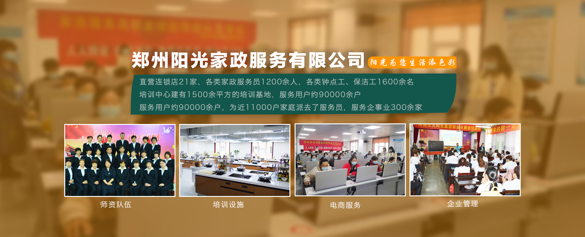 鄭州陽(yáng)光家政服務(wù)有限公司成立于1998年,是鄭州市第 一家經(jīng)工商登記的家政服務(wù)企業(yè),是以家政服務(wù)、家政培訓(xùn)、社區(qū)服務(wù)、社區(qū)養(yǎng)老、托幼護(hù)理、清洗保潔為一體的社區(qū)生活服務(wù)集成商。公司有直營(yíng)連鎖店21家,各類家政服務(wù)員1200余人,各類鐘點(diǎn)工、保潔工1600余名。鄭州陽(yáng)光家政商學(xué)院建有1500余平方的培訓(xùn)基地,···